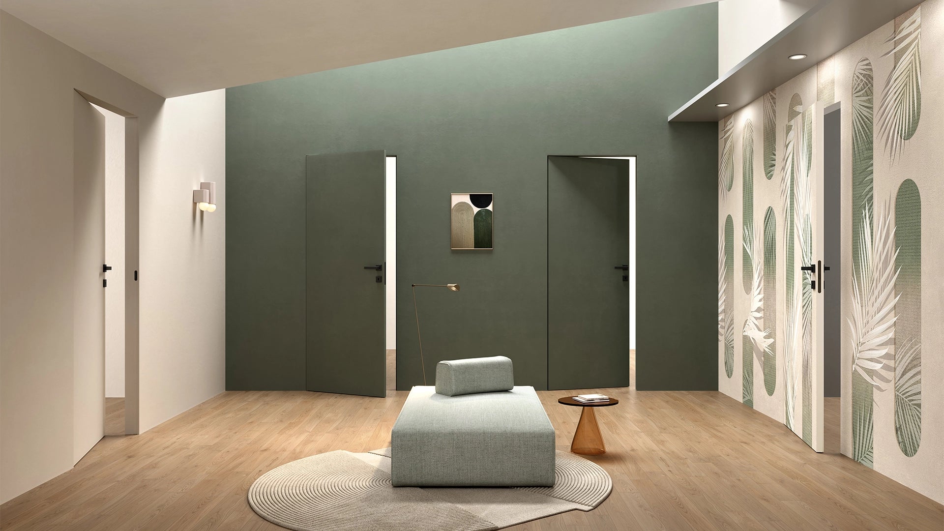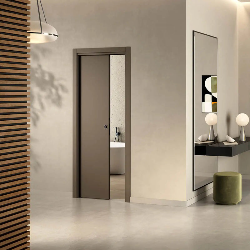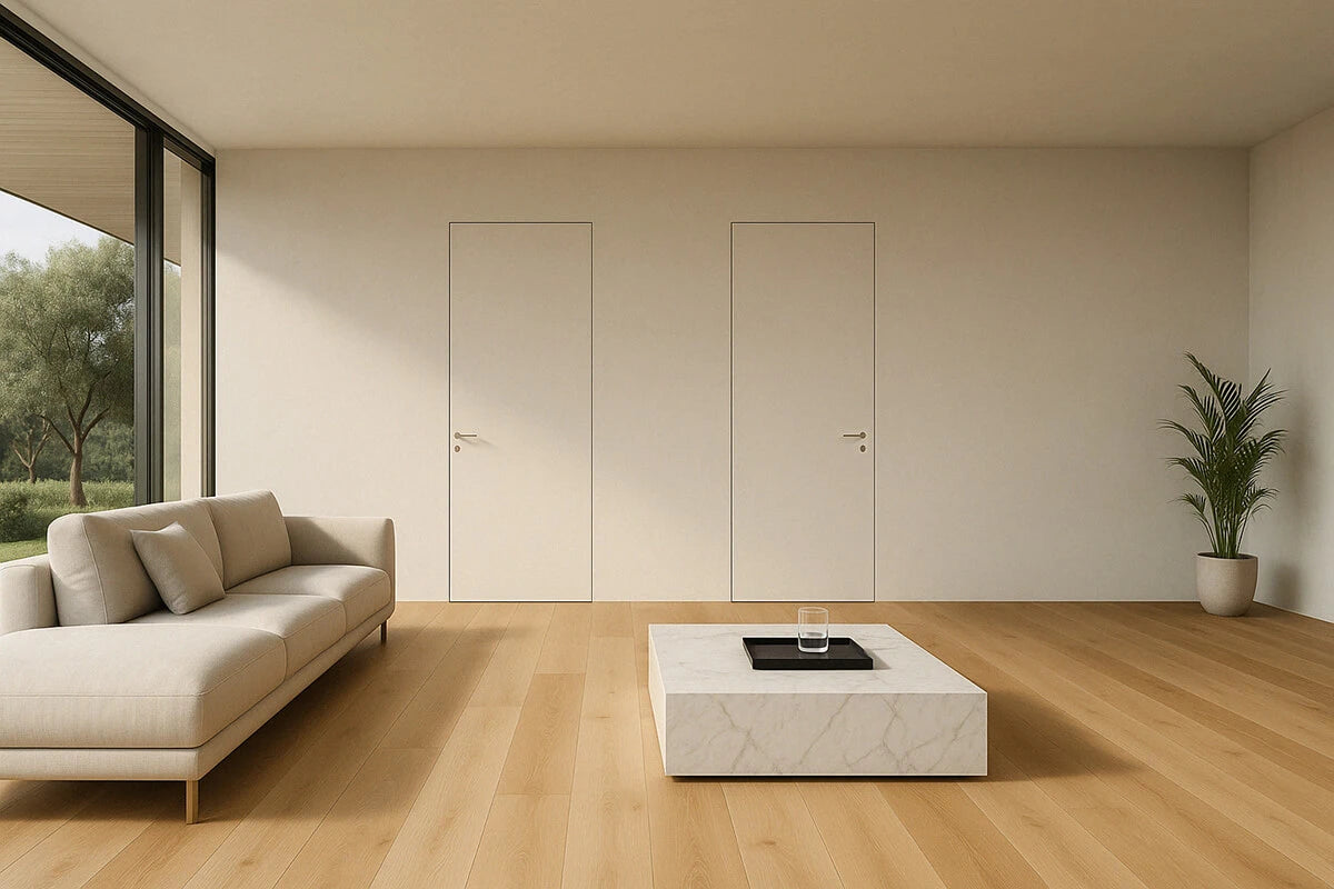 Unsere wandbündigen Türsysteme fügen sich dank minimalistischem Design nahtlos in jede Umgebung ein und schaffen Räume voller Balance und Eleganz.